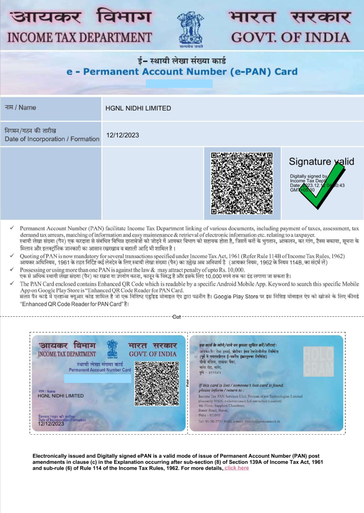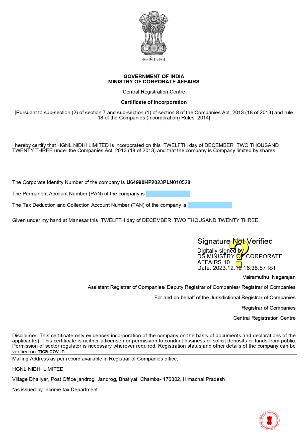 HGNL NIDHI LIMITED is proudly registered and governed under applicable financial and cooperative norms in India. Below is the official certificate issued by the concerned authority, validating our commitment to legal compliance and ethical operations.